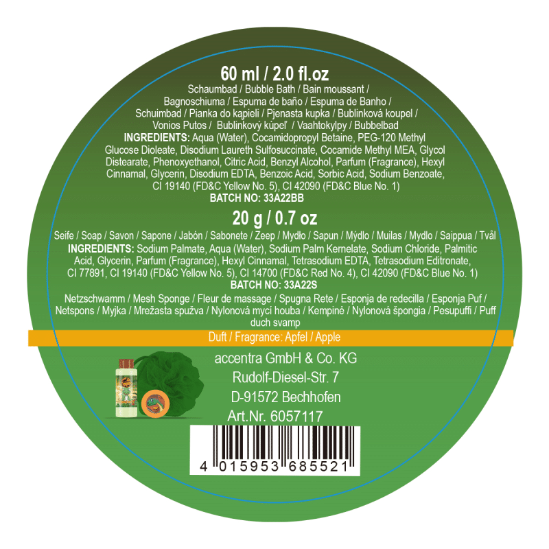 Bubble Bath / Schaumbad: Aqua (Water), Cocamidopropyl Betaine, PEG-120 Methyl Glucose Dioleate, Disodium Laureth Sulfosuccinate, Cocamide Methyl MEA, Glycol Distearate, Phenoxyethanol, Citric Acid, Benzyl Alcohhol, Parfum (Fragrance), Hexyl Cinnamal, Glycerin, Disodium EDTA, Benzoic Acid, Sorbic Acid, Sodium Benzoate, CI 19140 (FD&C Yellow No. 5), CI 42090 (FD&C Blue No. 1)