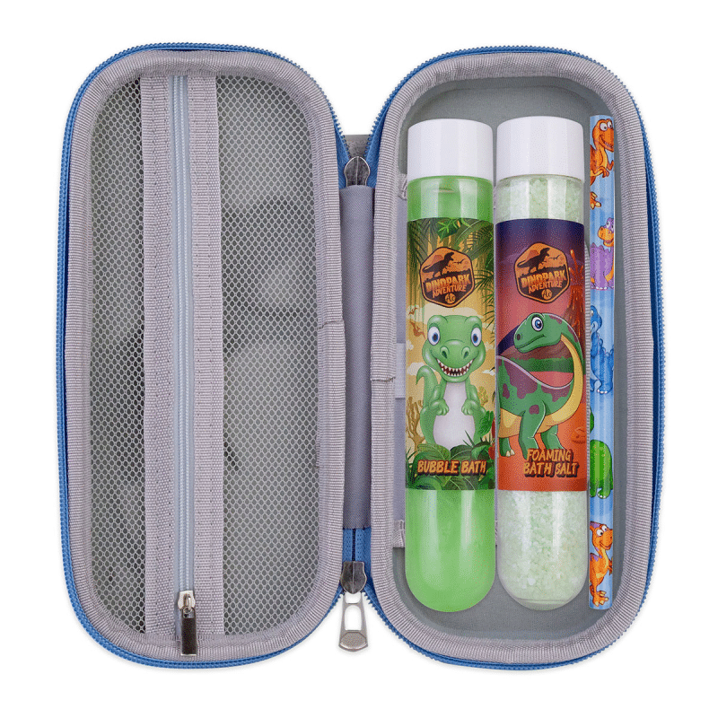 Das Badeset DINOPARK ADVENTURE in Federmäppchen ist das perfekte Geschenk. Das Set kommt in einem wiederverwendbarem Federmäppchen und ist direkt bereit zum verschenken. Enthalten sind ein Schaumbad, Badesalz und ein Bleistift mit Dinoprint somit kommt der Badespaß auf keinen Fall zu kurz! Die Badezusätze duften herrlich nach Apfel und sind ohne Parabene, sles-frei und vegan.