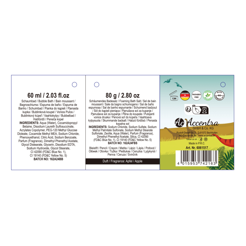 • 60ml Schaumbad, 80g Badesalz, Bleistift mit Dinoprint, für Kinder