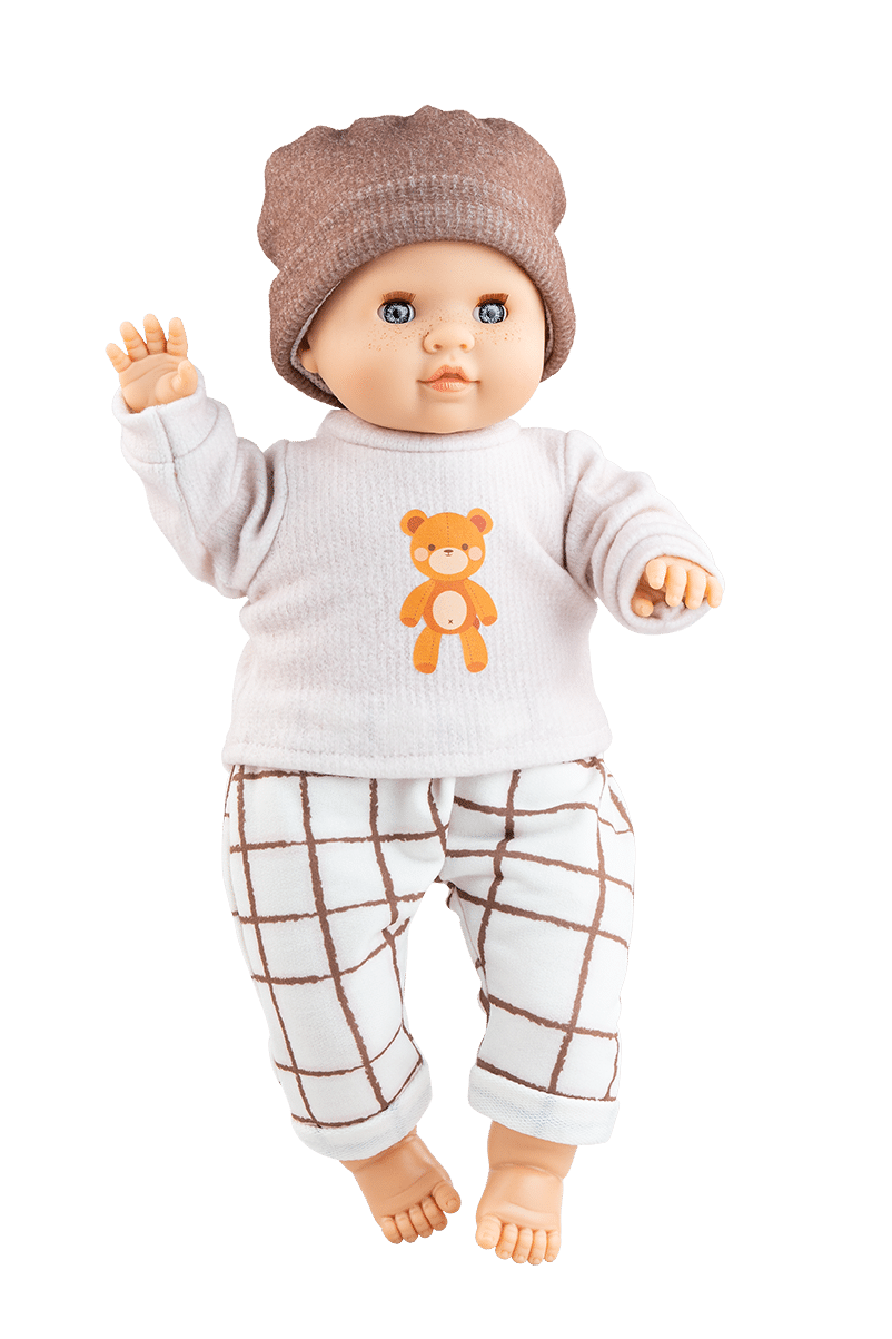 Die wunderschöne Paola Reina Puppe Juan aus der Reihe Los Manus begeistert vor allem durch ihren weichen Körper, ihre Schlafaugen und ihr tolles Outfit. Mit viel Liebe zum Detail entzückt die Baby Puppe Juan groß und klein. Sie trägt eine karierte Hose und einen hellen Pullover mit Teddy-Aufdruck sowie eine braune Mütze.